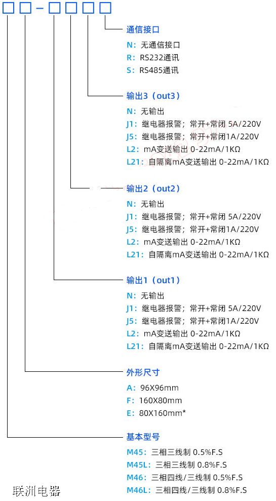 M45、M45L、M46、M46L系列三相電力表包含三相三線和四線制,可測量電壓、電流、頻率、有功功率、無功功率、功率因數(shù)、四象限電能(正負(fù)有功電能、正負(fù)無功電能),三排高亮數(shù)碼管自動(dòng)循環(huán)顯示或手動(dòng)切換顯示各測量值。具備1-3路報(bào)警開關(guān)量輸出或mA電流變送輸出,和Modbus標(biāo)準(zhǔn)通信協(xié)議。