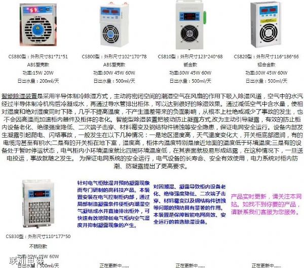 CS800、CS810、CS820、CS880配電柜除濕器 CS800、CS810、CS820、CS880系列的除濕器用于開關柜、配電柜、控制柜的除濕之用。這是一種排水弄除濕器,功率有大有小和相應的排水量。具體參數如下:看看視頻: Home > 配電柜 > 日期:2023-9-22 來源:m.daishuyu.com 發布:前前 閱讀: 上一篇:配電箱字母含義 圖紙中常見配電箱字母表示意思 下一篇:MTS-8030GY-32L、MTS-8060GY-32L電柜除濕器 配電箱安裝屬于什么工程 配電系統接地的設置 配電箱配置電器簡要說明 BCT系列電力配電用互感器 BCT系列電力配電用互感器 HBB-CS800電箱除濕器使用說明書.pdf 推薦 多功能電力儀表CPK-D3B的說明書HDZJ-130X 井蓋防盜系統行業國際形勢初學電工怎樣看懂電路圖 ZWN-G1(TH)智能溫度濕度控制器的產品概述接地電阻不準確的處理辦法和預防措施DH20G-100A電機保護器技術參數與使用S811R24N3S、S811R30N3S報價EVERQ6-320-6、QR75A1-I礦井風機起動裝置MZY1-5030、JJR2-200電動機晶閘管軟起R22空調內有空氣對空調有影響嗎 建議關注 消防泵啟動器MSKRQ1-S-7.5KP雙電源切換開關TLQ3-40排污泵啟動器JJ1-40KWATS雙電源開關BQ3-50A/4P智能雙電源自動轉換開關BJMQ8G-320/4PCB級雙電源轉換開關GFATS1-125/3PCBEPM-07電力網絡分析儀表雙電源切換開關W-N2/100A/4P(LCD)PZ211-1U1X1 數顯電壓表TH300VA-44離心風機軟啟動ADR5-45KW交直流電測儀表RC-EMP194Z-9HY水泵軟起動SNR5-400電力電容制造BSMJ0.42-20-1雙電源和雙回路切換裝置TKQG-800