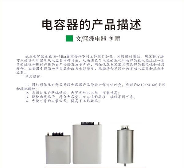 低壓電容器是在10-3Bar真空條件下對元件進(jìn)行加熱,同時進(jìn)行灌注。用這種方法可以使空氣和濕氣從電容器內(nèi)部排出,從而避免了電極的氧化和局部的放電經(jīng)過這一復(fù)雜的過程并進(jìn)行嚴(yán)格的出廠檢驗及質(zhì)量考評,確保低壓電容器具有良好的穩(wěn)定性和使用壽命。主要用于提高功率因數(shù)和改善電能質(zhì)量,根據(jù)場合不同分為單相電容器和三相電容器。