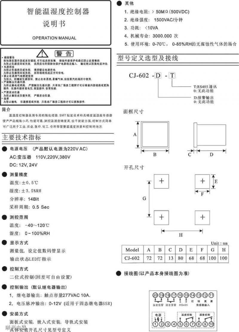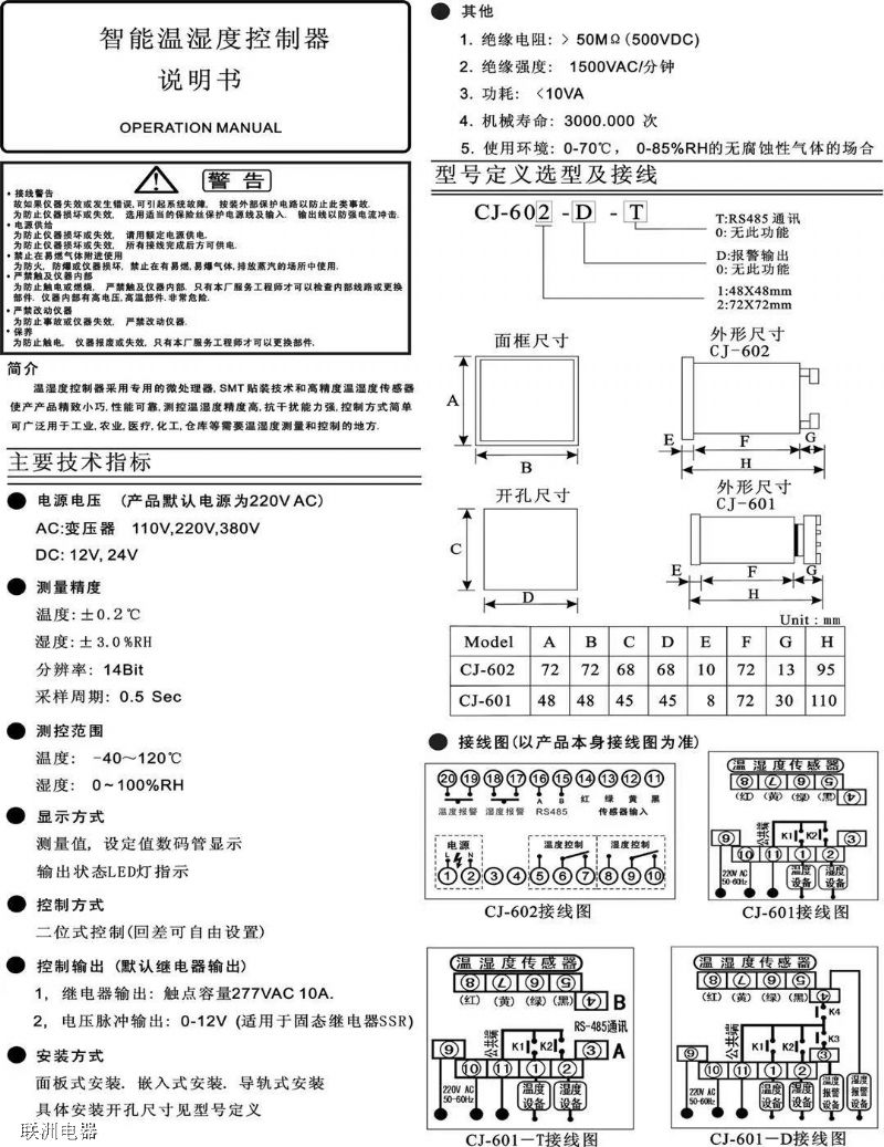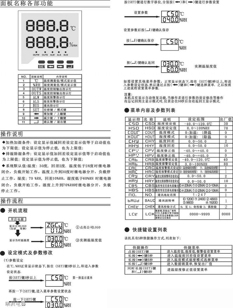 環境條件:溫度10~40攝氏度,濕度80%;溫濕度監控儀表滿足:1)當空氣濕度高于40%+5%時輸出報警(無源觸點開關信號);2)空氣溫度和濕度雙重監控,溫度的監控采用隨動式溫差控制方式,不采用設定值固定控制,即測量室內溫度-室外溫度小于1攝氏度以上時輸出報警無源開關接點信號,可以啟動加熱器,直至室內溫度-室外溫度高于5攝氏度時停止輸出報警無源接點信號,停止加熱;3)室內相對濕度高于40%+5%時輸出報警無源接點信號,可以啟動加熱器,直至室內空氣相對濕度低于30%時斷開該接點信號,可自動斷開電加熱器;4)測到的溫濕度參數可通過MODBUS RS485通訊口遠傳;5)測量精度不低于0.5級;6)儀表應防潮,絕緣性能好;7)具有一D的抗震能力和風壓能力;8)弱電回路絕緣電阻常溫時大于100M歐姆,180攝氏度時,絕緣電阻大于50M歐姆。