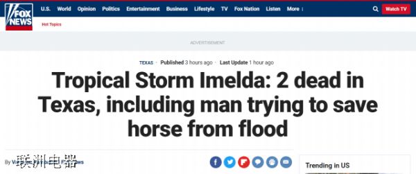 據(jù)美國(guó)福克斯新聞(Fox News)報(bào)道,2019年9月19日,受到熱帶風(fēng)暴“伊梅爾達(dá)”(Imelda)影響,美國(guó)得克薩斯州遭暴雨襲擊,街道積水,一名男子因救自己的愛馬而觸電身亡。